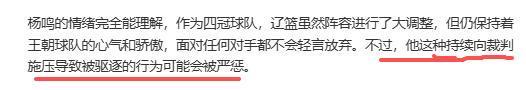 杨鸣坐等罚单吧,4媒体人发声:吹判无误,被驱逐或遭追加处罚