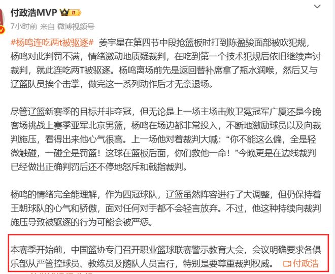 杨鸣接下来会不会被CBA追究责任?这点暂时不清楚,但杨鸣对于这件事可没有释怀,而是杠上了,在被驱逐的赛后的深夜2点,杨鸣在个人社媒上发布了一条短片,视频中用了国学大师王立群的一段经典发言来为自己昨晚的冲动行为做解释。